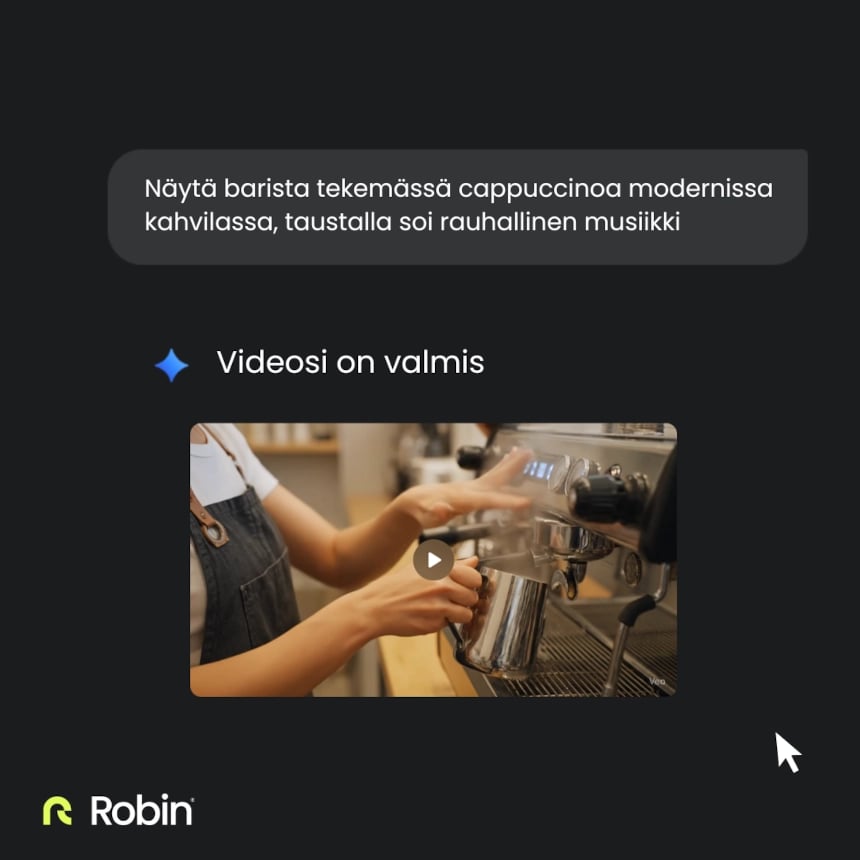 Ravintolat ja kahvilat: Julkaise video päivän annoksesta tai uudesta juomasta someen ja houkuttele asiakkaita vierailemaan jo samana päivänä. Verkkokauppa: Käytä tuotekuvaa, anna Veo AI:n animoida se ja luo kiinnostavia mainoksia. Konsultointi: Havainnollista palvelu tai prosessi yksinkertaisella AI-videolla ja tee esityksistäsi elävämpiä. Tapahtumat: Trailermainen video tekstin, päivämäärän ja AI-generoitujen kohtausten kera sopii nopeaan viestin levittämiseen.