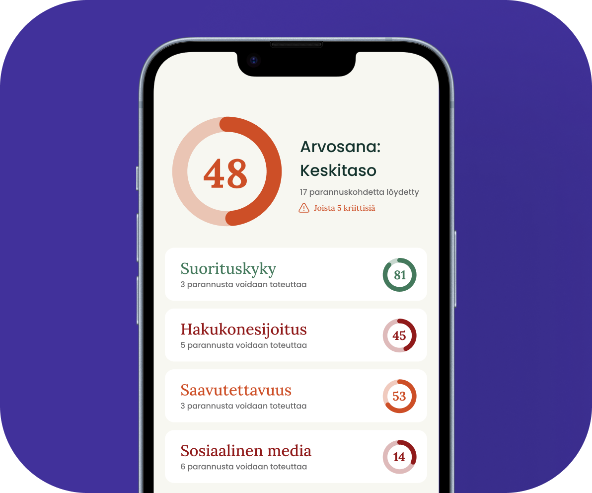 Katsomme, miten sivustosi pärjää kilpailijoihin verrattuna. Vertailun avulla näemme, mihin sivusi pystyy, ja annamme sinulle hyviä vinkkejä.