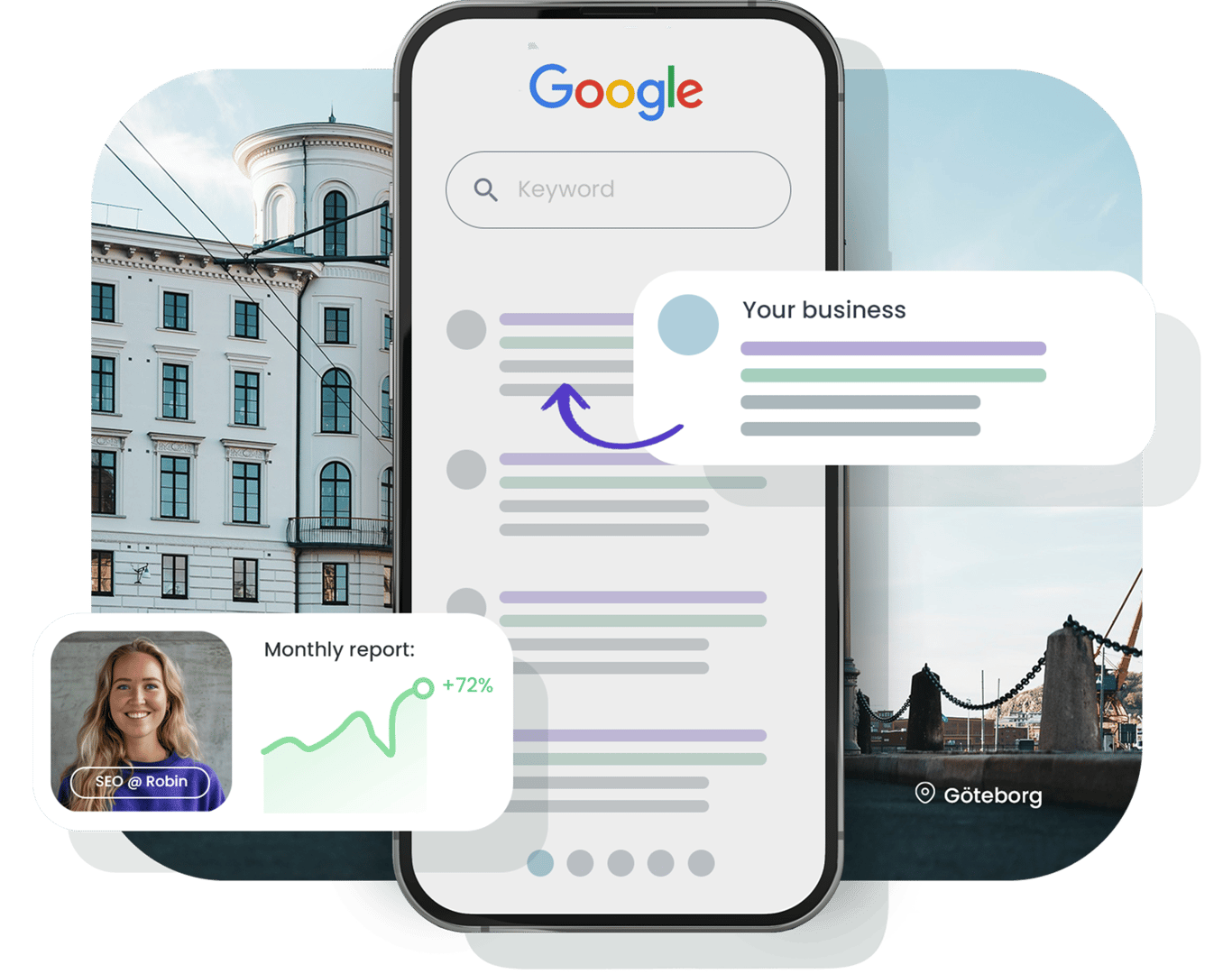 SEO ger högre ranking på Google och andra sökmotorer Attrahera lokala kunder i Göteborg som letar efter dina tjänster Nästan alla söker efter tjänster online – och sökmotoroptimering hjälper dig att synas när det verkligen gäller